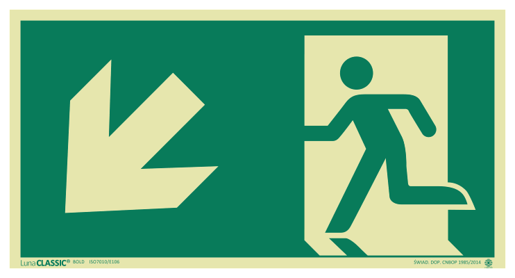 Znak KIERUNEK DO WYJŚCIA EWAKUACYJNEGO Z BŁONĄ KLEJĄCĄ W LEWO / DÓŁ 150×285